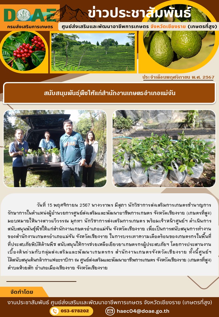 วันที่ 9 เมษายน 2567 นายวรวิทย์ คำสิงห์ นักวิชาการส่งเสริมการเกษตรชำนาญการ รักษาการในตำแหน่งผู้อำนวยการศูนย์ส่งเสริมและพัฒนาอาชีพการเกษตร จังหวัดเชียงราย (เกษตรที่สูง) มอบหมายให้นางนงเยาว์ ใสมรรคา นักวิชาการส่งเสริมการเกษตร พร้อมเจ้าหน้าที่ศูนย์ฯ สนับสนุนต้นกล้ากาแฟพันธุ์อะราบิกา จำนวน 1,000 ต้น แก่นายโกวิทย์ แก้วดอนดู่ บ้านเลขที่ 66 หมู่ที่ 4 ตำบลป่าก่อ อำเภอดอยหลวง จังหวัดเชียงราย เพื่อนำไปปลูกในพื้นที่ของเกษตรกร ณ ศูนย์ส่งเสริมและพัฒนาอาชีพการเกษตร จังหวัดเชียงราย (เกษตรที่สูง) ตำบลห้วยสัก อำเภอเมืองเชียงราย จังหวัดเชียงราย